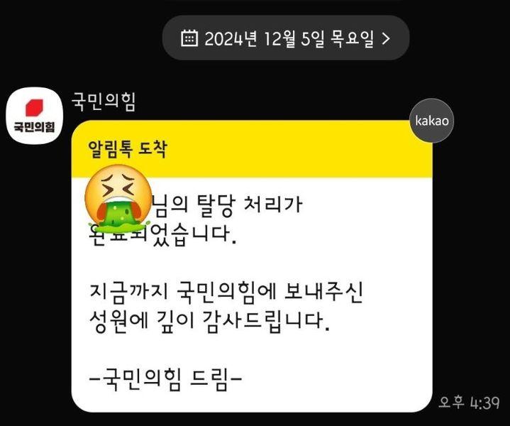 5일 각종 온라인 커뮤니티에는 국민의힘 탈당 완료 알림톡을 인증하는 사진이 올라오고 있다.