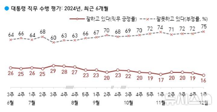 여론조사 회사 한국 갤럽이 3~5일 만 18세 이상 남녀 1001명을 대상으로 한 '윤 대통령 직무 수행 평가'에서 '잘하고 있다'는 16%, '잘못하고 있다'는 75%로 나왔다.
