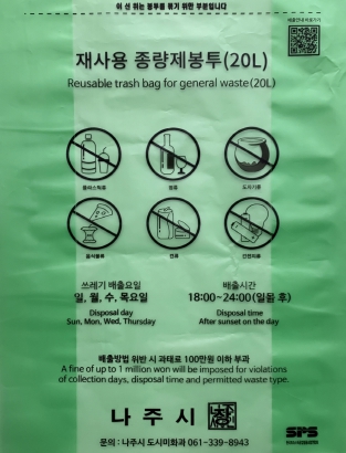 새롭게 판매되는 종량제봉투는 20일부터 나주시 전역의 종량제봉투 판매소에서 구매할 수 있으며 자세한 사항은 도시미화과로 문의하면 된다.