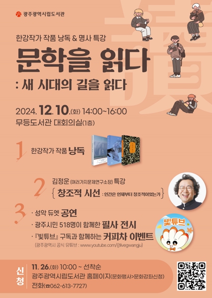 광주시립도서관은 노벨문학상 시상식 당일인 12월10일 오후 2시부터 무등도서관 대회의실에서 낭독회를 연다. 독서동아리 회원, 필사 참여자, 빛고을 책읽는 시민 등 총 5명이 낭독자로 참여해 한강 작가의 작품을 함께 느끼고 생각하는 시간을 갖는다.