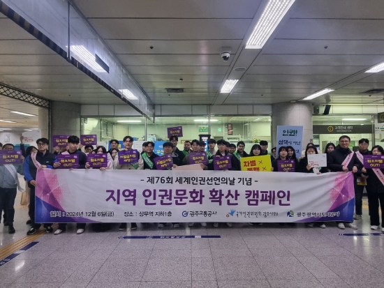 공사는 6일 서구 상무역에서 국가인권위원회 광주사무소, 광주도시공사와 함께 ‘인권문화 확산을 위한 유관기관 합동 인권 캠페인’을 펼치고, 도시철도 이용객과 시민을 대상으로 공사의 인권 경영 정책들을 홍보하며 존중과 배려의 인권 문화 확산에 지역사회가 동참할 것을 권장했다.
