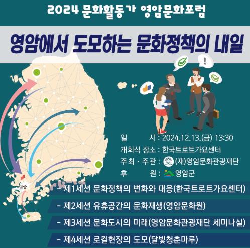 이번 포럼은‘영암에서 도모하는 문화정책의 내일’을 주제로, 지역 문화 활성화와 문화정책의 혁신방안을 논의하는 장이 될 예정이다.