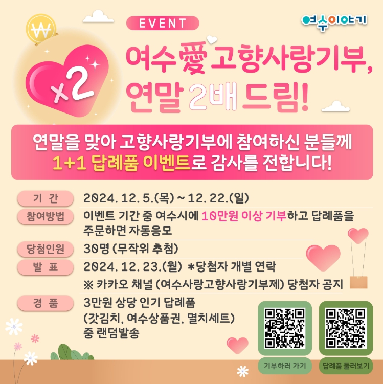 시 관계자는 “올 한 해 고향사랑기부제로 여수 발전에 기여해 주신 모든 분께 진심으로 감사드린다”며, “내년에도 다양한 이벤트를 추진해 고향사랑기부 활성화에 힘쓰겠다”고 말했다.