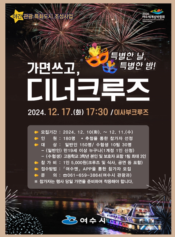 ‘프라이빗 디너크루즈’는 가면을 쓰고 여수 밤바다를 만끽하는 야간관광 특화도시 관광상품으로, 참가자들에게 특별한 밤을 선사할 예정이다.