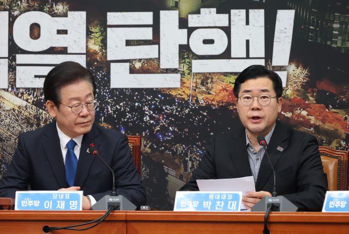 박 원내표는 전날 비상계엄 당시 계엄군 지휘관이었던 곽종근 전 육군 특수전사령관의 증언을 언급하며 "윤석열이 12·3 내란에 우두머리, 내란 수괴임을 누구도 부인할 수 없게 됐다"며 헌법이 정한 질서 있는 퇴진은 탄핵밖에 없다고 잘라 말했다.