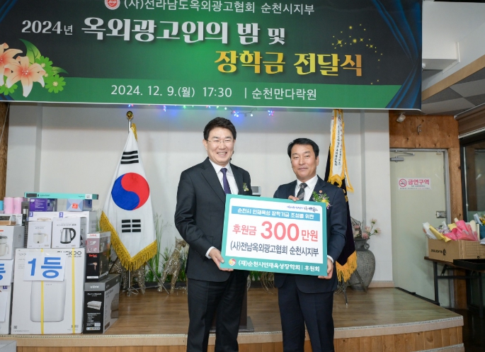 이날, 사단법인 전라남도 옥외광고협회 순천시지부에서는 후진양성에 힘써 달라며 순천시인재육성장학회에 3백만원을 기탁했으며, 학업성적이 우수하고 타의 모범이 되는 학생들 5명에게 각각 40만 원씩 장학금을 전달했다.