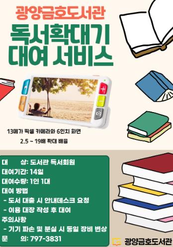휴대용 독서확대기는 도서와 함께 관외 대여가 가능하며, 이용을 원할 시 안내데스크에서 이용 대장을 작성하고 간단한 이용 안내 사항을 확인 후 대여할 수 있다.