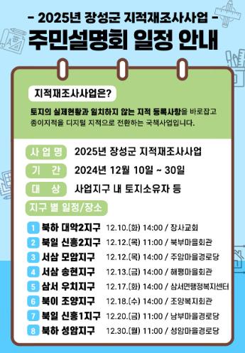 장성군은 주민설명회 이후 토지소유자 · 토지면적의 3분의 2 이상 동의를 얻어 전라남도에 지적재조사사업지구 지정을 신청할 예정이다.