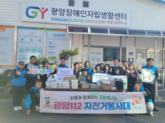 이번 후원사업은 112자전거봉사대가 지난 10월 광양전통숯불구이축제에서 탄소중립실천 판매(자원순환: 헌옷 외 모든 재활용품)로 마련된 기금수익금 3백만원을 3개소 복지시설(광양장애인자립센터, 광양장애인평생교육원, 광양YMCA청소년인권센터)에 총 6회(24.12월~25.5월)에 걸쳐 밑반찬을 직접 조리·배식·배달까지 추진하고, 당일 학교밖 위기청소년 지원을 위해 1백만을 YMCA 청소년 인권센터에 대원들이 십시일반 모금한 후원금을 추가로 전달했다.