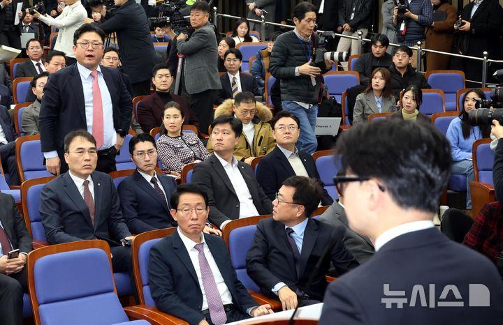 한 대표 입에서 '내란 자백' 이라는 단어가 나오자 자리에 앉은 의원들이 술렁이기 시작했다. 대통령실 시민사회수석 출신인 강승규 의원은 "이게 무슨 소리냐", "(연단에서) 내려와라"라고 소리쳤다.