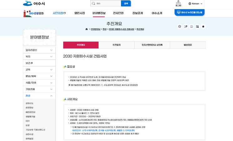 관련 정보는 여수시 누리집에 접속 후 ‘분야별정보’-‘환경’-‘2030 자원회수시설 건립사업’ 항목에서 누구나 확인할 수 있다.