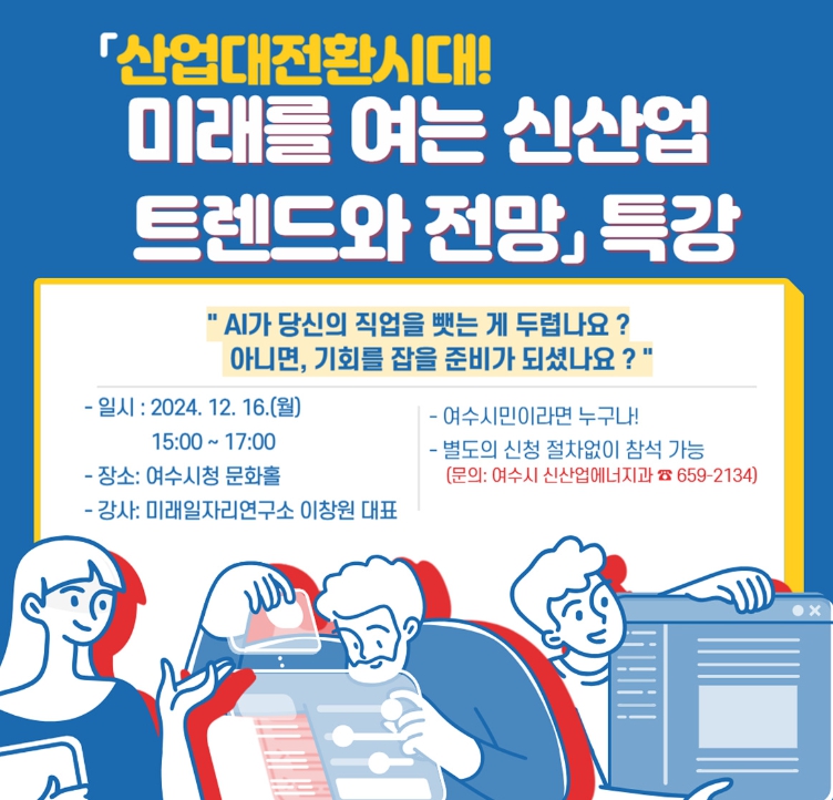 이번 강의는 수도권에서 활동하고 있는 미래일자리연구소 이창원 대표가 맡아 급변하는 4차산업혁명 및 포스트 코로나 시대의 산업 패러다임 전환, 이에 따른 신산업 전망과 대응 전략 등을 소개할 예정이다.