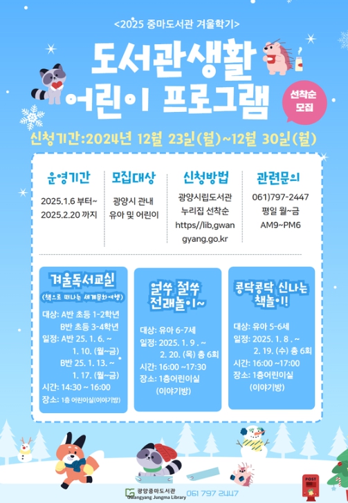 이용민 중마도서관팀장은 “어린이들이 겨울학기 프로그램에 참여해 배움의 기쁨을 경험하며 창의력과 잠재력을 개발하고 꿈과 희망을 마음껏 펼치길 바란다”고 말했다.