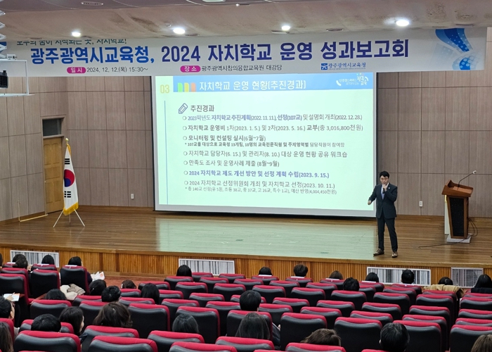 이와 관련, 시교육청이 12일 광주광역시창의융합교육원 대강당에서 올해 자치학교 141개교와 2025학년도 신규 참여학교 교직원 200여 명을 대상으로 ‘2024 자치학교 운영 성과보고회’를 개최했다.