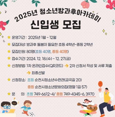 청소년방과후아카데미는 여성가족부와 순천시가 지원하는 국가정책사업으로 방과 후 돌봄이 필요한 청소년들에게 학습 지원, 체험 활동, 자기 개발 활동, 생활관리, 특성화 프로그램 등 종합 서비스를 제공하는 프로그램이다.