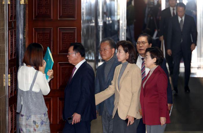 앞서 국민의힘은 지난 7일 탄핵소추안 표결 보이콧을 당론으로 정했다. 전날 선출된 권성동 신임 원내대표도 "이미 '탄핵 반대'로 결정된 당론을 변경하기 위해서는 당헌·당규에 따른 절차가 필요하다"며 추후 다시 논의하겠다고 말했다.