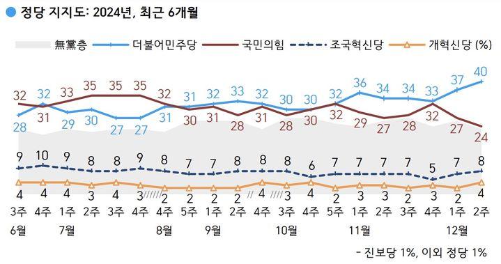 한국갤럽이 지난 10일부터 12일까지 전국 만 18세 이상 1002명을 대상으로 12월 2주 차 정당 지지도를 조사한 결과 국민의힘은 24%, 민주당은 40%로 집계됐다. 조국혁신당 8%, 개혁신당 4%, 이외 정당·단체 1%, 특정 정당을 지지하지 않는 무당층은 23%로 나타났다.
