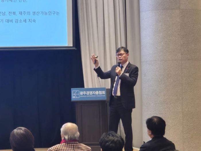 이성룡 광주지방고용노동청장은 광주경영자총협회(회장 양진석 ㈜호원·해피니스CC 회장)가 개최한 1671회 금요조찬포럼에서 `알아두면 도움되는 고용노동정책’이란 주제의 강연을 통해 지역 경제의 어려움을 이야기했다.