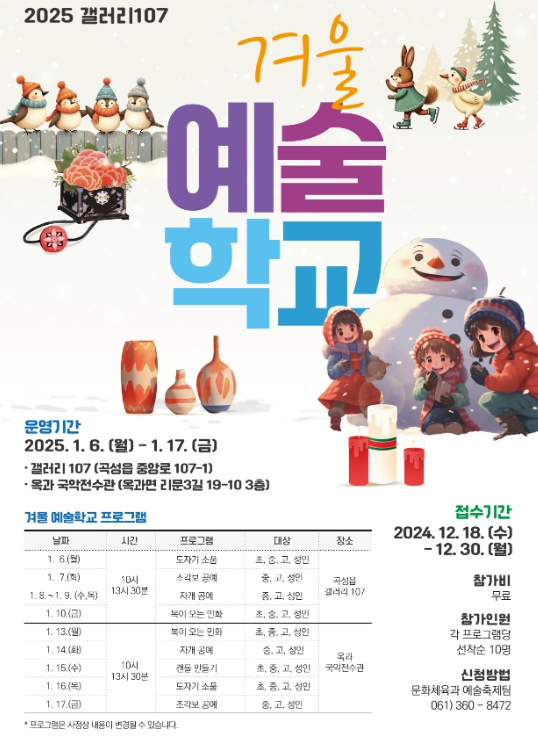 이번 겨울 예술학교는 내년 2025년 1월 6일부터 17일까지 곡성읍 중앙로에 위치한 ‘갤러리 107’과 옥과면 사또골 문화센터 3층 ‘국악전수관’에서 진행하며 겨울 방학 동안 지역 청소년과 성인 등 200명을 대상으로 다양한 예술 조형 경험을 제공한다.