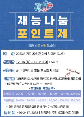 재능 나눔 포인트제에 대한 자세한 안내는 영암군 주민복지과에서 안내한다.