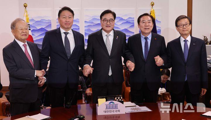 최 회장은 "기업들이 경영에 전념할 수 있도록 경제 정책만큼은 흔들리지 않고 추진됐으면 한다"며 "여야 모두 민생 안정에 대한 의지를 드러내고 있는데 초당적 협력을 통해 무쟁점 법안만이라도 연내 통과시켜 준다면 대한민국이 정상적으로 작동하고 있다는 긍정적 시그널이 될 것"이라고 말했다.