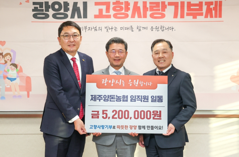 전달식에는 제주양돈농협 임직원 52명을 대표해 고권진 조합장과 고정근 팀장, 윤동하 계장이 참석했으며, 우광일 광양상공회의소 회장과 김양구 사무국장도 이날 행사에 함께 참석해 자리를 빛냈다.