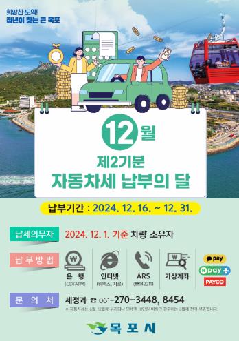 이번 자동차세는 2024년 12월 1일 현재 자동차등록원부상 소유자에게 부과되며, 1월·3월·6월·9월에 연세액을 납부했거나 6월에 연세액(10만원 미만)이 부과된 차량은 제외된다.