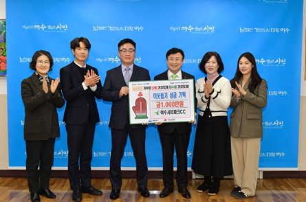 여수시에 따르면 지난 13일 시장실에서 열린 성금 전달식에 정기명 여수시장과 하제욱 여수시티파크CC 대표이사 등 4명이 참석해 후원증서를 전달했다.
