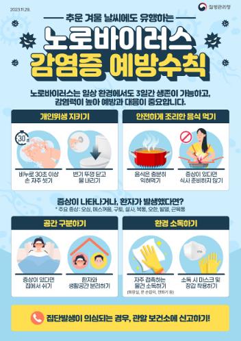 정영화 복지건강국장은 “겨울철 노로바이러스 감염증을 예방하기 위해서는 손 씻기 등 예방수칙 준수와 안전하게 조리된 음식 섭취가 중요하다”며 “영유아 보육시설이나 학교 등에서 집단환자 발생 때는 가까운 보건소로 즉시 신고해달라”고 당부했다.