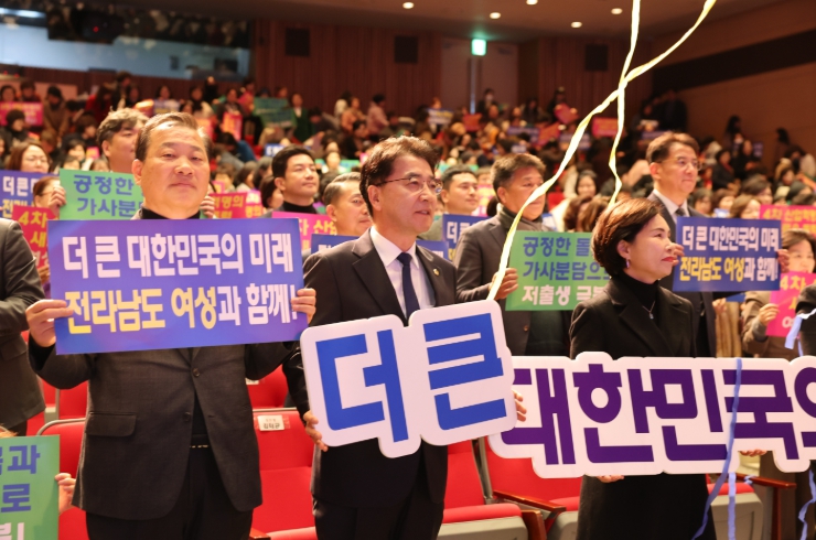 ‘더 큰 대한민국의 미래, 전라남도 여성과 함께’라는 주제로 열린 이날 여성대회에는 김영록 지사와 전남도의회 이광일 부의장, 도의원, 도・시군 여성단체 회원 등 1,000여 명이 참석한 가운데 식전공연, 여성단체 활동영상 상영에 이어 유공자 표창, 결의문 채택, 퍼포먼스 순으로 진행됐다.