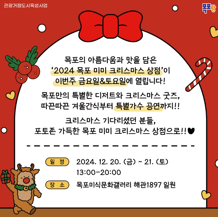 지난해에 이어 두 번째로 개최되는 이번 행사는 아름답고 맛있는 도시 목포만의 감성을 담은 먹거리와 굿즈(팬 상품)가 있는 플리마켓(벼룩시장)에 크리스마스 분위기를 더해 목포만의 특색있는 경험을 선보일 계획이다.
