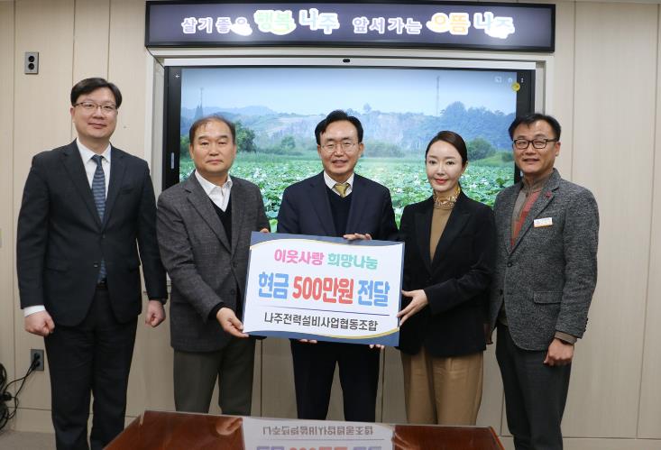 윤병태 나주시장은 “항상 취약계층을 위해 후원을 아끼지 않는 나주전력설비사업협동조합에 진심으로 감사드린다”며 “소중한 기부금이 꼭 필요한 분들에게 쓰일 수 있도록 최선을 다하겠다”고 전했다.