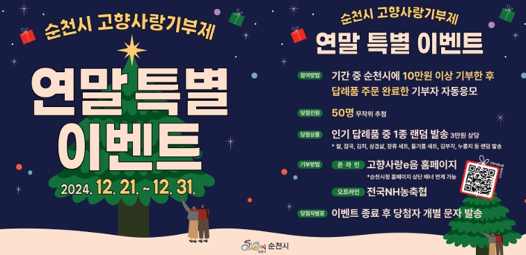 시 관계자는 “연말정산 시즌을 맞아 고향사랑기부제 활성화와 감사의 마음을 전하고자 인기 답례품 추가 증정 이벤트를 지난 11월에 이어 추가로 준비했으니, 많은 분들의 참여를 부탁드린다”고 말했다.