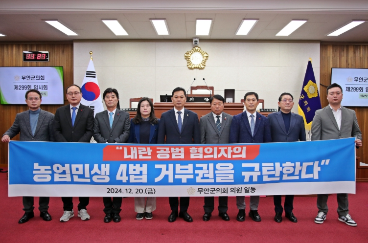 군의회는 성명서를 통해 “농민은 기후 재난과 생산비 폭등, 쌀값 폭락으로 소상공인은 얼어붙은 경기와 계엄 후폭풍으로 벼랑 끝에 서 있다”며 “내란 공범 혐의자에 의해 행해진 농업・민생 4법에 대한 거부권 행사는 묵과할 수 없는 또 한 번의 폭거”라고 비판했다.