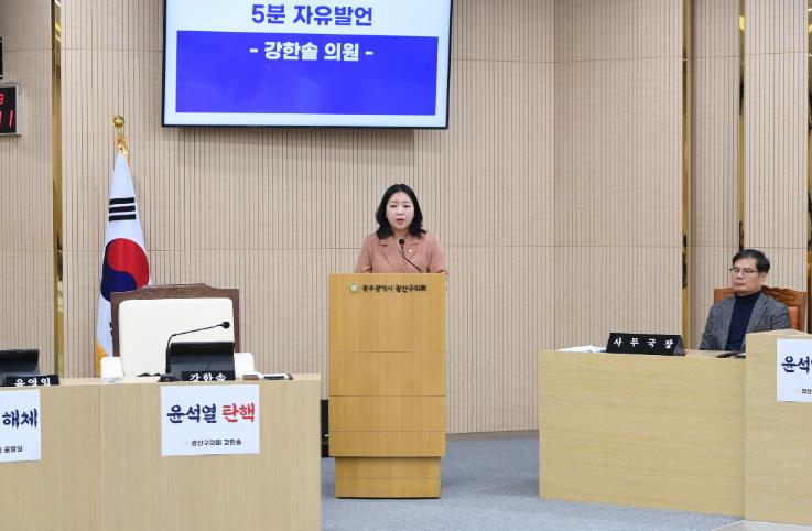 강한솔 의원은 “최근 광산구의 체육시설 직영 운영 전환 계획은 직영 복지시설이라 자율성·유연성에 한계가 있다는 주장과 이율배반적 행보다”며 “10억 이상의 세금, 80여 명의 복지기관 노동자 그리고 41만 구민의 복지생태계와 연관된 문제인 만큼 복지재단 설립을 원점에서 재검토해야 한다”고 요청하며 5분 자유발언을 마쳤다.