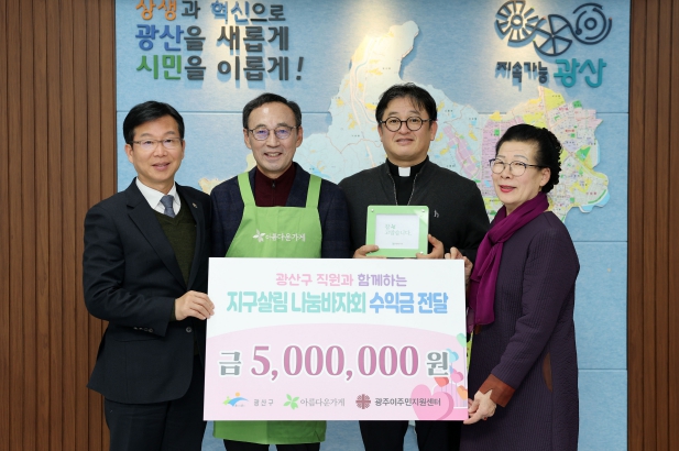 광산구는 20일 아름다운가게 광주목포본부가 구청에서 전달식을 갖고 광주이주민지원센터(센터장 황성호 신부)에 지구살림 나눔바자회 수익금 500만 원을 전달했다고 밝혔다.
