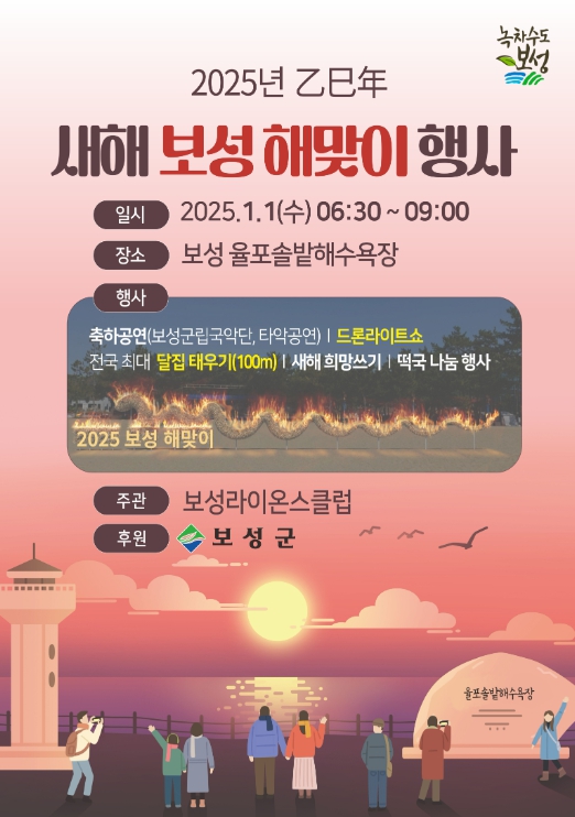 군 관계자는 “볼거리 가득한 행사인 ‘2025년 보성 새해 해맞이 행사’에 함께해 ‘꿈과 행복이 넘치는 희망찬 보성’에서 행복한 새해를 맞이하시길 바란다.”라고 전했다.