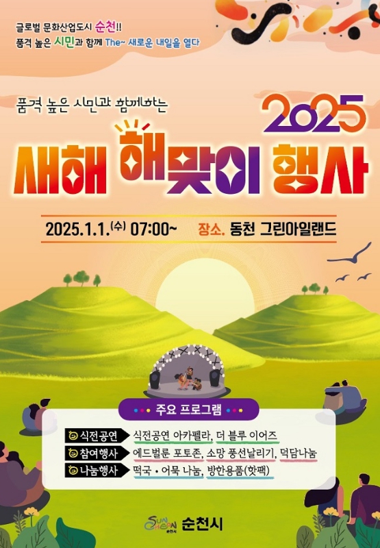 시 관계자는 “동천 그린아일랜드는 순천의 대표적인 해맞이 장소로 각광받고 있다”며 “많은 시민들이 함께 모여 새해를 맞이하고 소망을 나누는 좋은 시간이 되길 바란다”고 말했다.