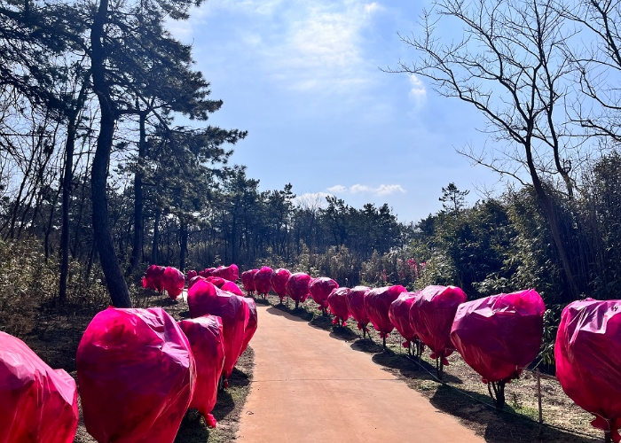 형형색색 다채로운 풍경은 멀리서 보면 마치 물감을 뿌린 듯하고 가까이 다가가면 나무에 씌워진 비닐 색채가 예술 조형물처럼 보인다.