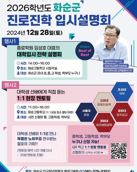 조미화 인구청년정책과장은 “이번 설명회는 우리 학생들의 진로 선택을 돕기 위해 특별히 기획된 행사로 학생 또는 자녀의 입시 전략 수립과 진로에 귀중한 기회가 될 것이다. 학생과 학부모님들의 많은 관심과 참여를 부탁드린다.”라고 전했다.