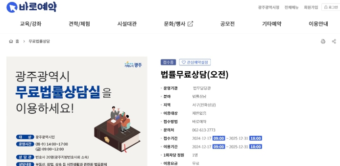 광주시 무료 법률상담은 화요일·수요일 오후 2시부터 5시까지, 금요일 오전 9시부터 12시까지로 매주 3회 사전 예약제로 운영된다. 상담시간은 1인당 20분 정도다. 민사·형사·가사 등 다양한 분야의 법률문제에 대해 광주지방변호사회 소속 변호사의 상담을 무료로 받을 수 있다.