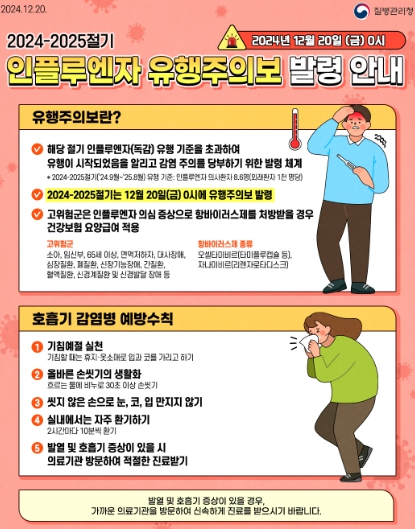 앞서 질병관리청은 지난 20일 전국에 ‘인플루엔자 유행주의보’를 발령했다. 인플루엔자는 감기 증세를 일으키는 인플루엔자 바이러스에 의해 발생하는 급성호흡기질환으로 ‘독감’으로도 불린다.