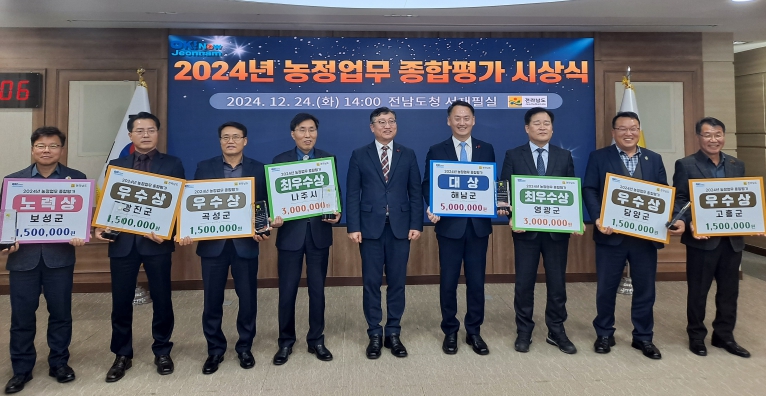 이번 종합평가와 함께 분야별 우수시군 평가에선 ▲친환경농업 육성 분야 대상에 해남군, 최우수상 고흥군, 우수상 담양군·진도군 ▲식량원예 분야 대상 강진군, 최우수상 화순군·해남군, 우수상 장성군·영광군·고흥군 ▲농식품유통 분야 대상 해남군, 최우수상 나주시·곡성군, 우수상 순천시·담양군·강진군·영광군이 수상했다.
