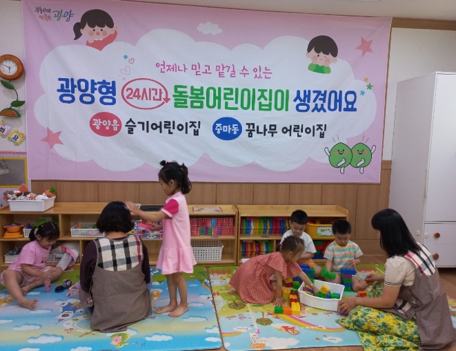 광양시는 긴급돌봄이 필요한 부모의 부담을 줄이기 위해 24시간 어린이집 2개소를(광양읍 슬기어린이집, 중마동 꿈나무 어린이집) 운영 중이다.