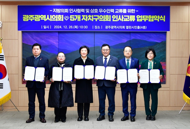 이날 협약식에는 신수정 의장, 서용규 제1부의장, 채은지 제2부의장, 정다은 운영위원장, 문선화 동구의회의장, 전승일 서구의회의장, 남호현 남구의회의장, 최무송 북구의회의장, 김명수 광산구의회의장 등이 참석했다.