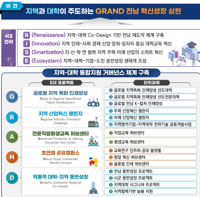 전남RISE 기본계획은 ‘지역과 대학이 주도하는 그랜드(GRAND) 전남 혁신성장 실현’을 목표로 ▲글로벌 지역특화 인재양성 ▲지역 산업혁신 챌린지 ▲전문직업 평생교육 허브센터 ▲초연결 공유캠퍼스 ▲역동적 대학-지역 동반성장 등 5대 프로젝트 기반 15개 단위과제로 구성됐다.
