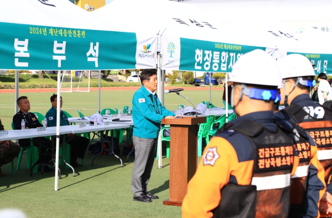 올해 곡성군은 다양한 재난 상황에 대비하고자 훈련유형과 장소를 변경하여 지진·화재 복합재난상황을 가정하고 곡성레저문화센터 다중밀집시설에서 경찰·소방·군부대 관계기관과 민간단체 등 200여 명이 참여한 가운데 재난안전통신망(PS-LTE)을 활용하여 단체장이 참여한 가운데 토론·현장훈련으로 진행했다.