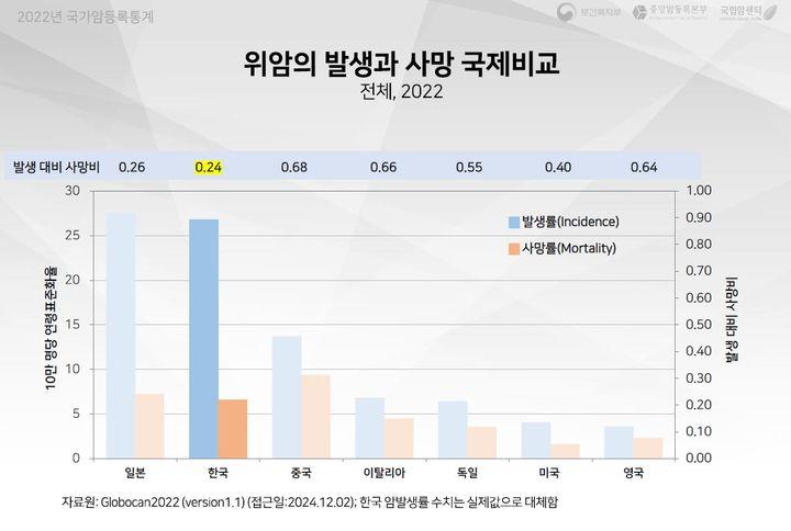 암 발생 대비 사망 비율은 해외 주요국과 비교해도 낮은 편이다. 해당 비율은 위암의 경우 한국이 0.24%로 일본 0.26%, 미국 0.40%, 독일 0.55%, 영국 0.64%과 비교했을 때 최하위였다. 대장암(0.27%)과 유방암(0.08%)도 같은 나라들 사이에서 발생 대비 사망률이 최저치였다.