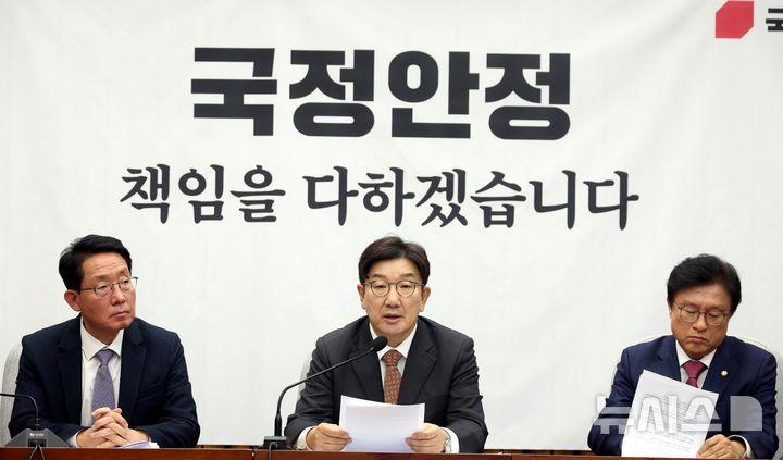 권 원내대표는 "국정혼란과 국가적 손실이 불 보듯 뻔한대도 민주당이 탄핵을 남발하는 이유는 따로 있다"며 "조기대선 정국을 유도해 이재명 민주당 대표의 사법리스크를 덮으려는 속셈이다. 5개 재판에 쫓기는 이 대표를 위해 조급하게 탄핵안을 난사하고 있다"고 주장했다.