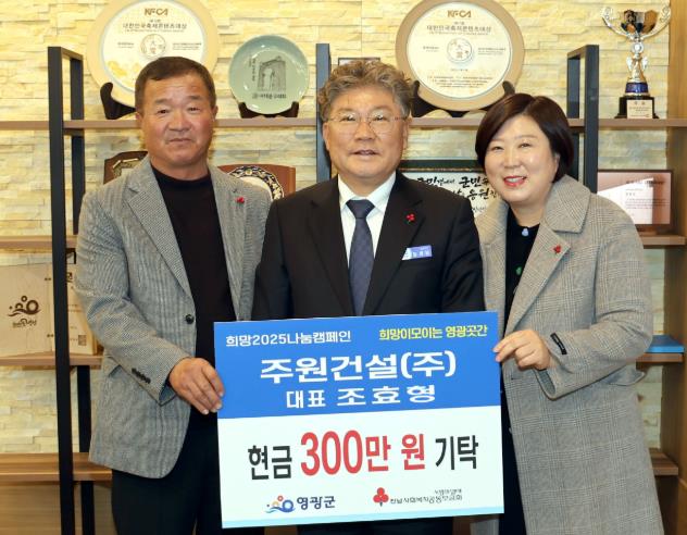 영광군 관계자는 “모두가 어려운 상황에서도 따뜻한 정성을 모아주신 조효형 대표님께 감사드린다. 이번 기탁이 나눔 문화를 더욱 확산시키는 계기가 될 것이며, 나눔 활동이 널리 알려져 더 많은 군민이 기부활동에 동참할 수 있기를 바란다.”라고 말했다.